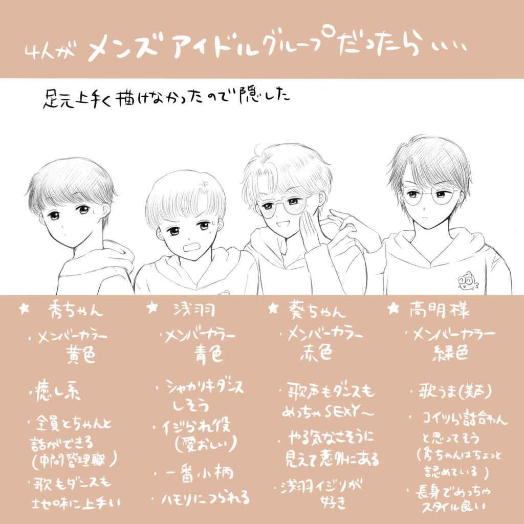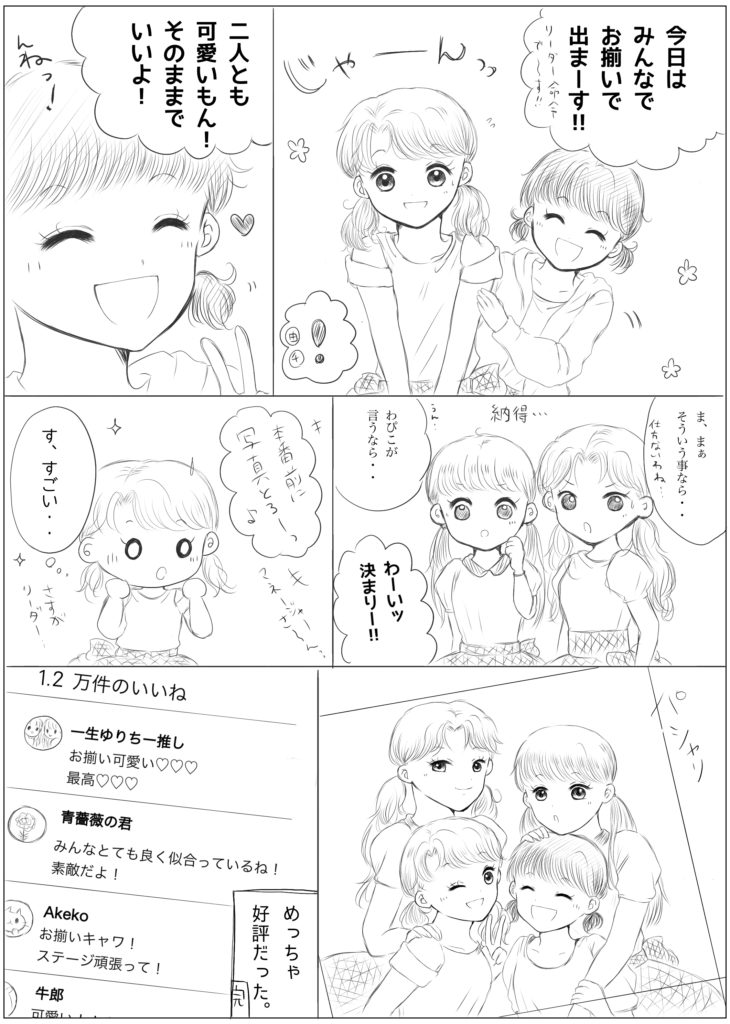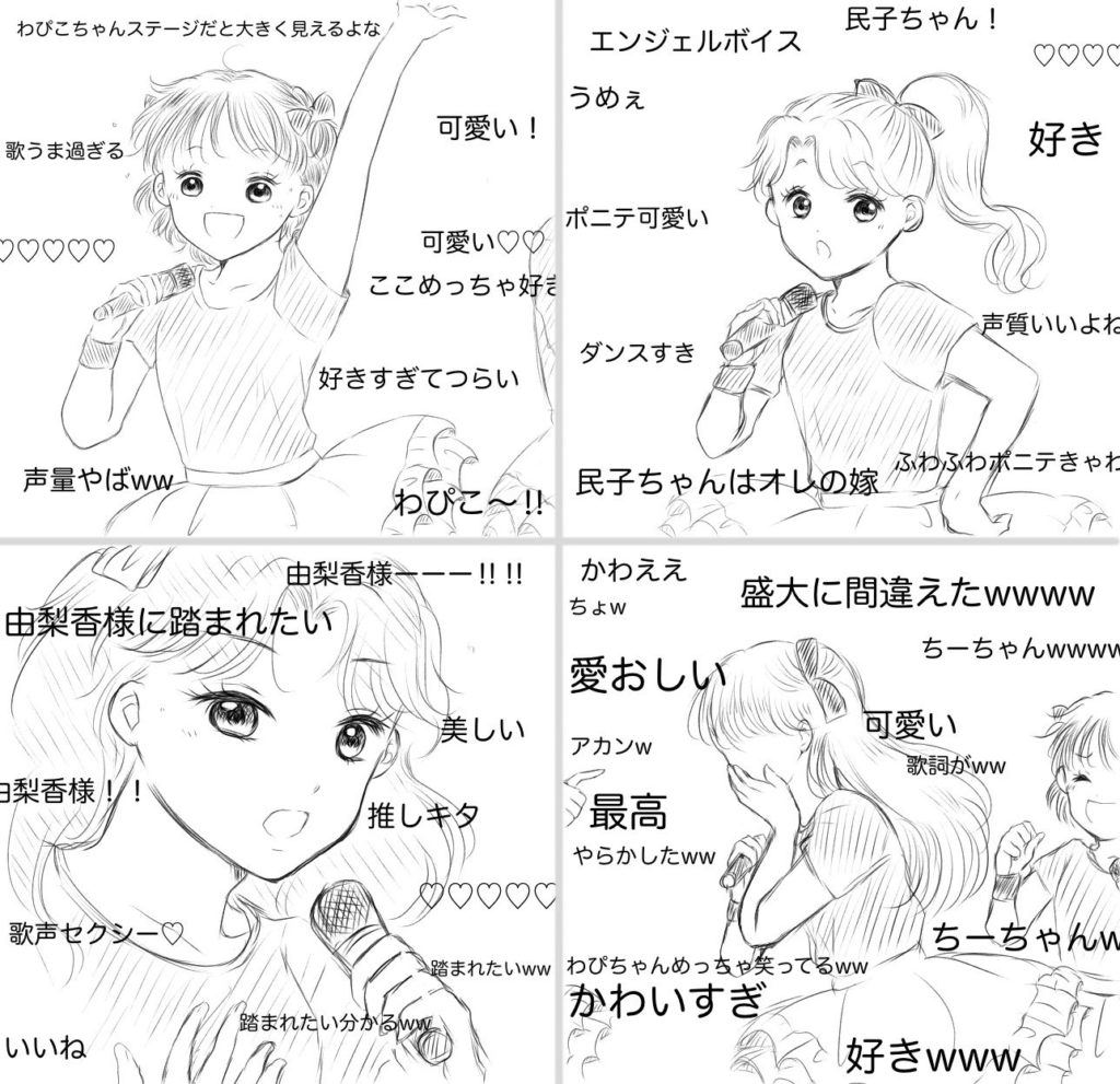 ドルパロ もしも女子4人がアイドルやってたら・・な妄想漫画 わぴちゃん→天真爛漫人気 民子ちゃん→ゆるふわ人気 ゆりちー→不仲人気 コメント付きでライブ生配信中! twitterの相互様に頂いたネタ♡ おまけのゆりか様 favorite送信中です×